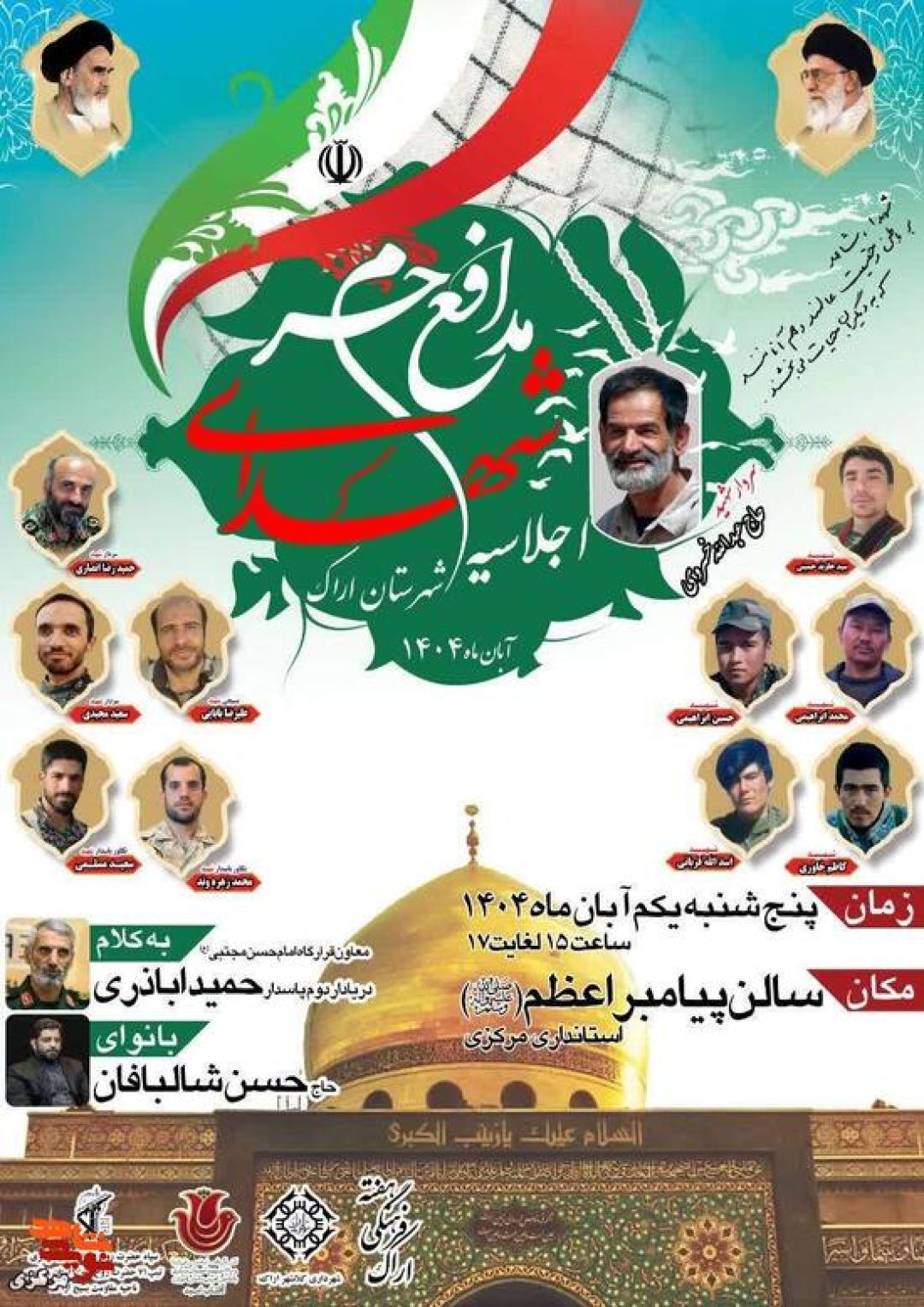 اجلاسیه شهدای مدافع حرم شهرستان اراک روز پنجشنبه، یکم آبانماه، از ساعت ۱۵ تا ۱۷ در سالن پیامبر اعظم(ص) استانداری مرکزی با حضور خانوادههای معظم شهدا، ایثارگران، مسئولان و اقشار مختلف مردم برگزار میشود.