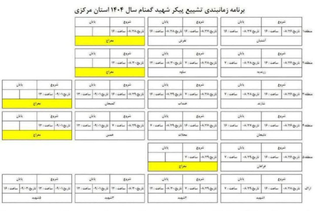 منطقه پنج شاهد برگزاری مراسم در فراهان در تاریخ ۲۶ آبان است و این شهید نیز پس از خاتمه برنامهها به معراج شهدا منتقل میشود.