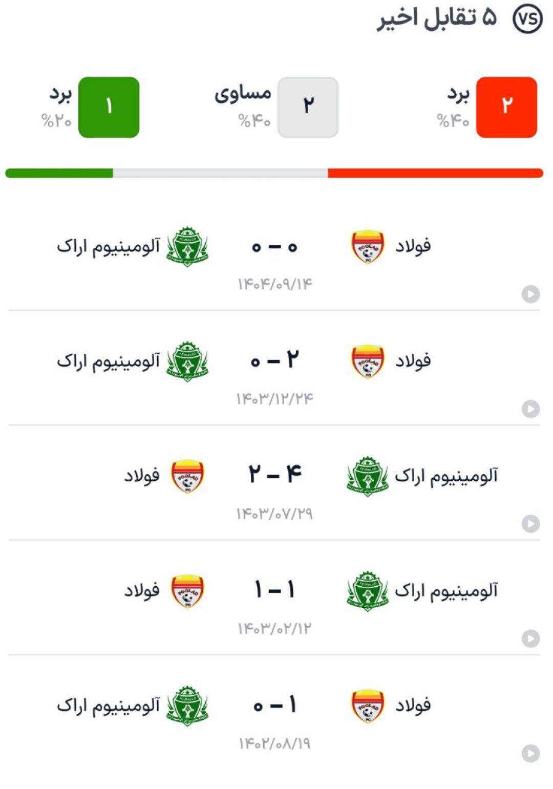 ۵ تقابل دو تیم فوتبال آلومینیوم اراک و فولاد خوزستان در پنج مسابقه اخیر، یک برد سهم تیم فوتبال آلومینیوم اراک و دو بازی نیز به تساوی رسیده و دو برد نیز سهم فولاد خوزستان است.
