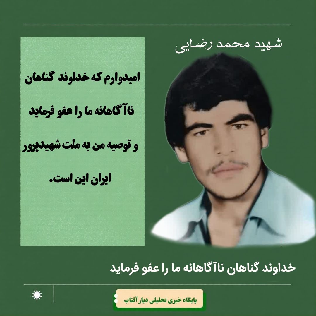در بخشی از وصیتنامه شهید «محمد رضایی» آمده است: امیدوارم که خداوند گناهان ناآگاهانه ما را عفو فرماید و توصیه من به ملت شهیدپرور ایران این است.