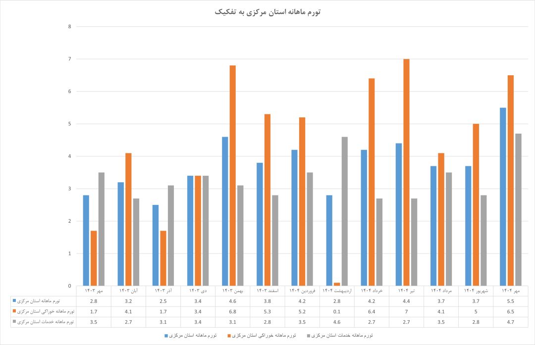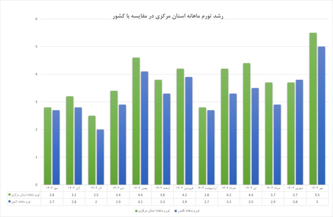 در تیرماه ۱۴۰۴ فاصله این شاخص بین استان مرکزی و میانگین کشوری به ۷/۴ درصد رسید و در آخرین آمار مهرماه ۱۴۰۴، این شکاف به ۸/۴ درصد افزایش یافته است. این در حالی است که نرخ تورم در کل کشور نیز روندی افزایشی داشته و بنابراین بالاتر بودن نرخ استان مرکزی نشاندهندهی افزایش شتاب رشد قیمتها با آهنگی سریعتر از میانگین ملی است. به بیان دیگر، تورم در استان نه تنها مهار نشده بلکه به مرحلهی افسارگسیختگی ساختاری نزدیک شده است.