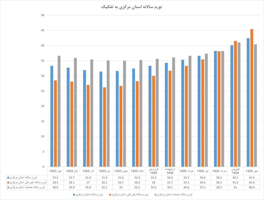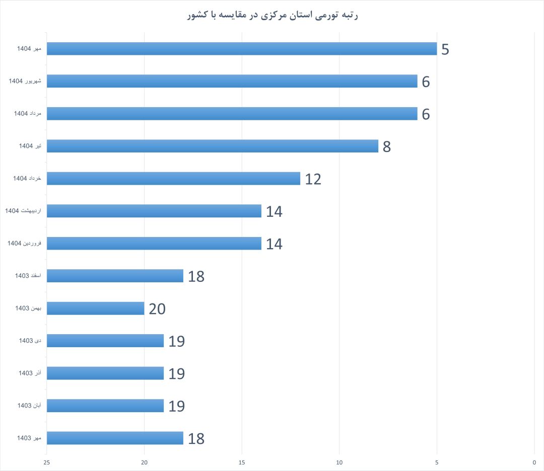 بررسی روند تورم سالانه استان مرکزی از مهر ۱۴۰۳ تا مهر ۱۴۰۴ نشان میدهد که استان از یک وضعیت نسبتاً کنترلشده، به یکی از نقاط بحرانی تورم در کشور تبدیل شده است. تا پایان سال ۱۴۰۳، تورم سالانه استان مرکزی همچنان پایینتر از میانگین کشوری قرار داشت و رتبه آن در میان استانهای دارای بیشترین تورم بین ۱۷ تا ۲۰ در نوسان بود. اما از فروردین ۱۴۰۴ ورق برگشت؛ از آن زمان، نرخ تورم سالانه استان از میانگین کشور پیشی گرفت و این فاصله در ماههای بعد بهصورت پیوسته افزایش یافت.
