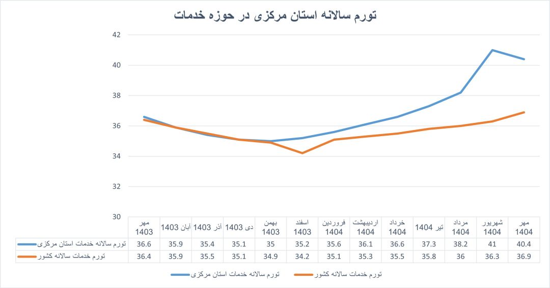 این موضوع از آن جهت اهمیت دارد که بیش از دو سوم وزن شاخص کل تورم مربوط به خدمات است. از مهر ۱۴۰۳ تا اسفند همان سال، تورم خدمات در استان مرکزی هممسیر با کشور و حتی تا حدودی کاهشی بود، اما از اسفند به بعد، روندی کاملاً صعودی را آغاز کرد.