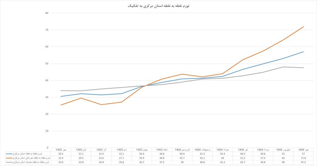اما از دیماه ۱۴۰۳، تورم نقطه به نقطه استان از میانگین کشور عبور کرد و نخستین سیگنال جدی افزایش سرعت تورم در استان مرکزی ظاهر شد. در همین ماه رتبه استان در تورم نقطه به نقطه از بیستم به دوازدهم ارتقا یافت و تنها یک ماه بعد، در بهمن و اسفند ۱۴۰۳، رشد قیمتها چنان شتاب گرفت که در تیرماه ۱۴۰۴ استان مرکزی به رتبه دوم تورم نقطه به نقطه کشور رسید.