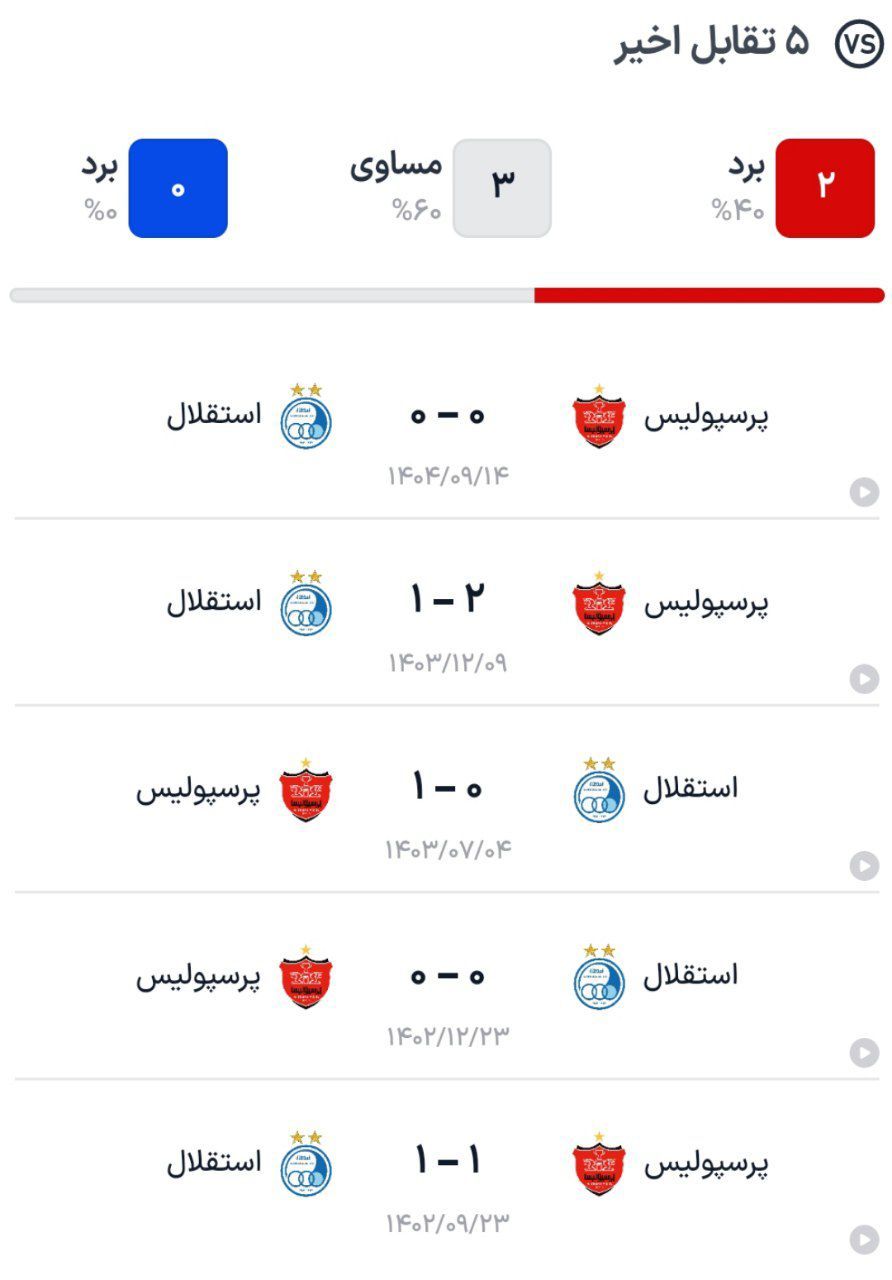 ۵ تقابل دو تیم فوتبال پرسپولیس و استقلال در پنج مسابقه اخیر، ۲ برد سهم تیم فوتبال پرسپولیس و ۳ بازی دو تیم نیز به تساوی رسیده و تیم فوتبال استقلال هنوز موفق به کسب برد مقابل تیم فوتبال پرسپولیس نشده است.