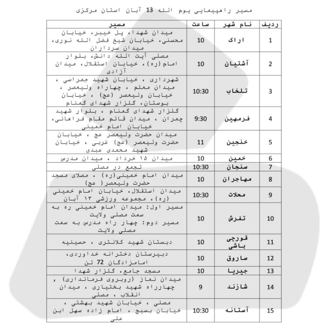 مسیرهای راهپیمایی ۱۳ آبان در استان مرکزی