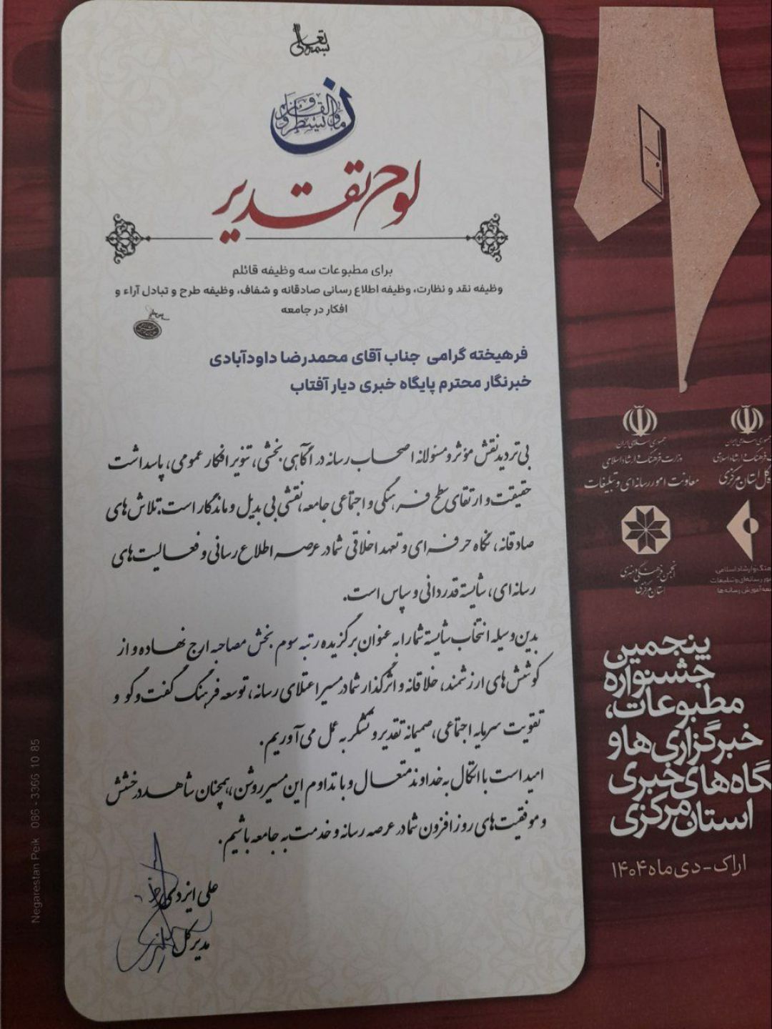 در این آئین محمدرضا داودآبادی مدیر مسئول پایگاه خبری تحلیلی دیار آفتاب عنوان سوم در بخش مصاحبه را کسب و مورد تقدیر قرار گرفت.