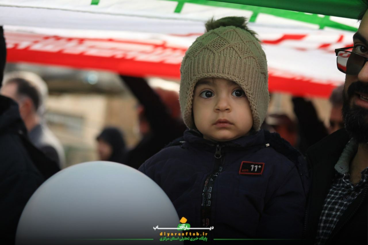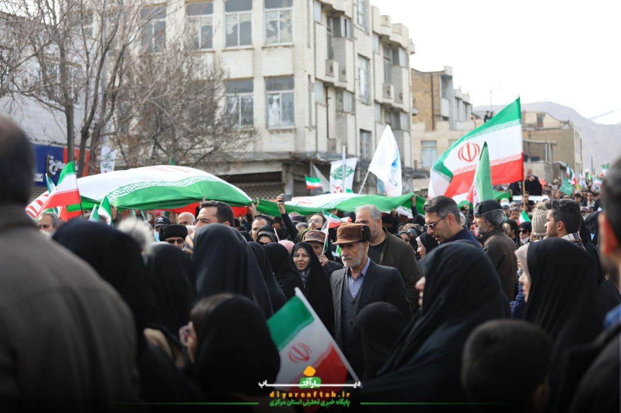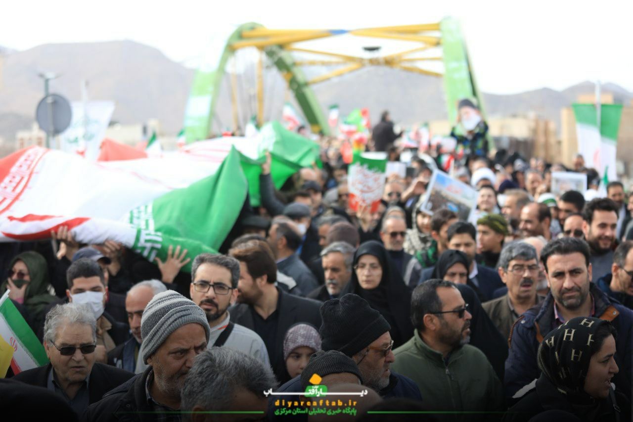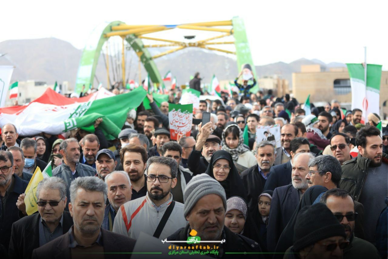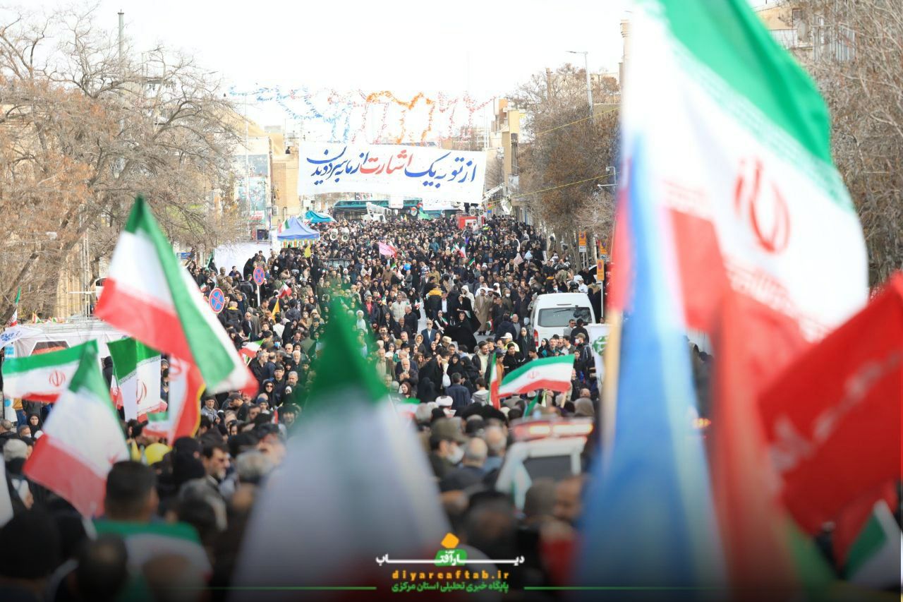 راهپیمایی ۲۲ بهمن در اراک در فضایی پرشور و منظم در حال برگزاریست، شرکتکنندگان با در دست داشتن پرچمهای ایران و پلاکاردهایی با مضامین انقلابی، در مسیرهای اعلامشده حرکت می کنند و در طول مسیر، شعارهایی همچون «اللهاکبر»، «استقلال، آزادی، جمهوری اسلامی» و دیگر شعارهای مرتبط با این مناسبت سر می دهند.
