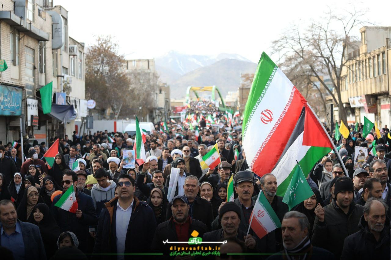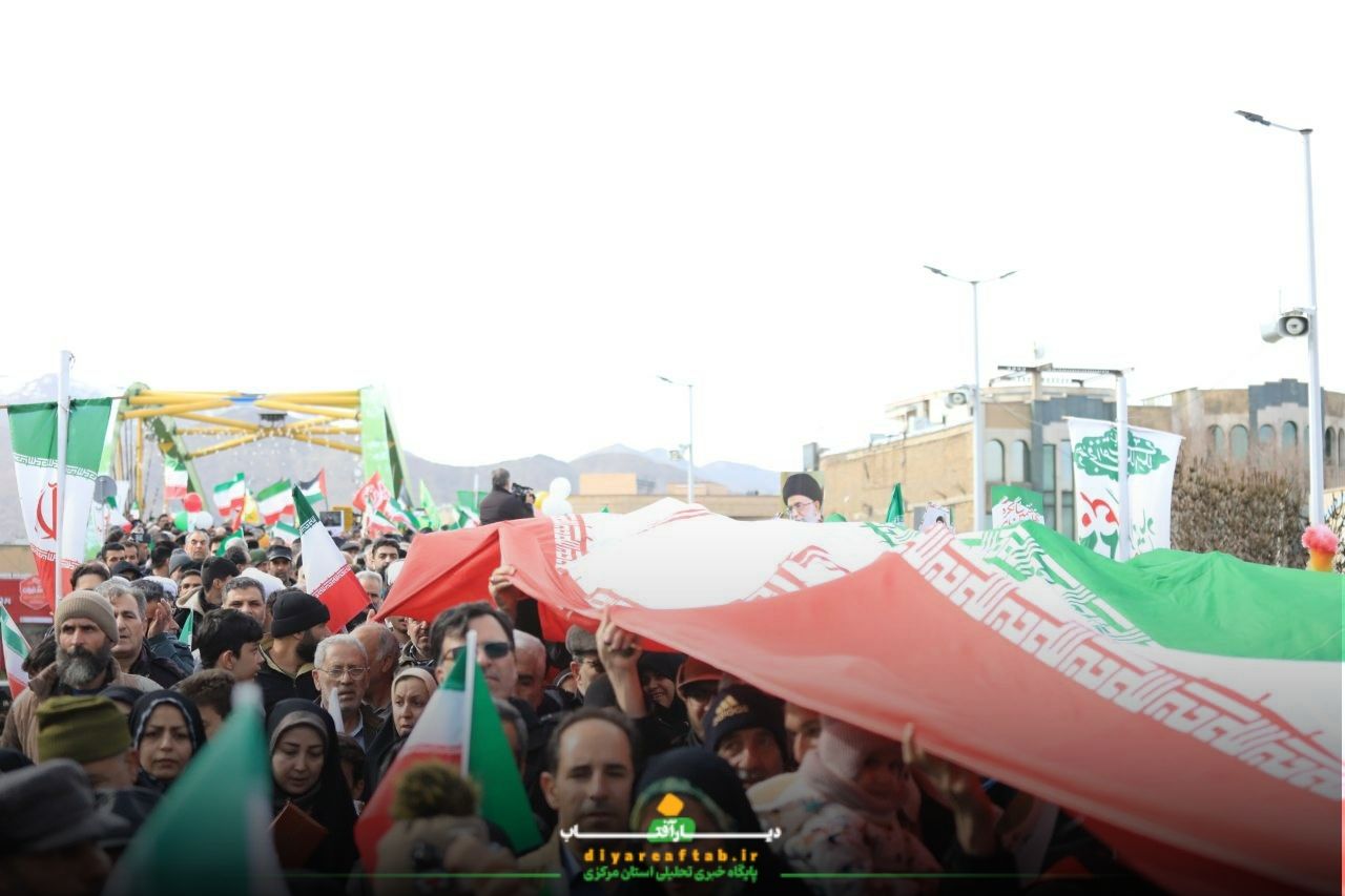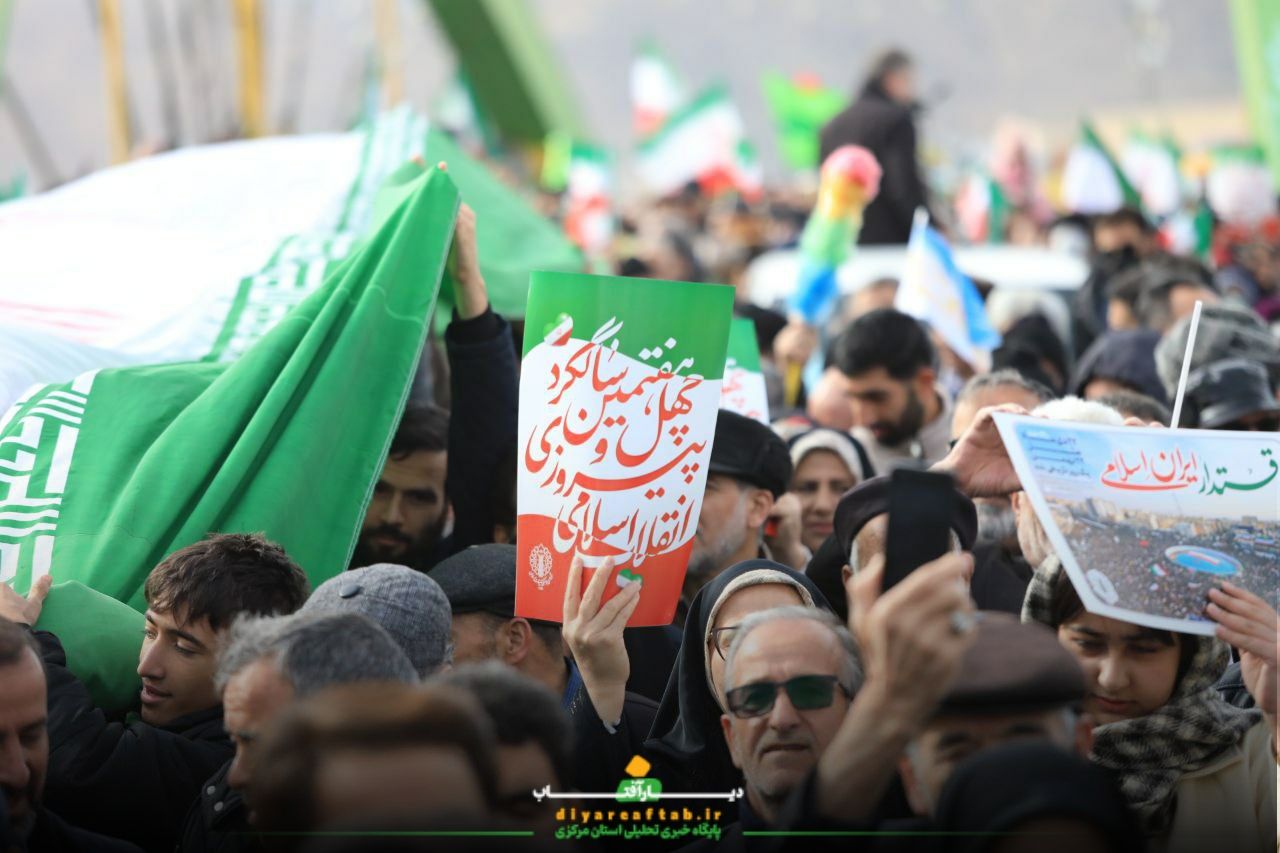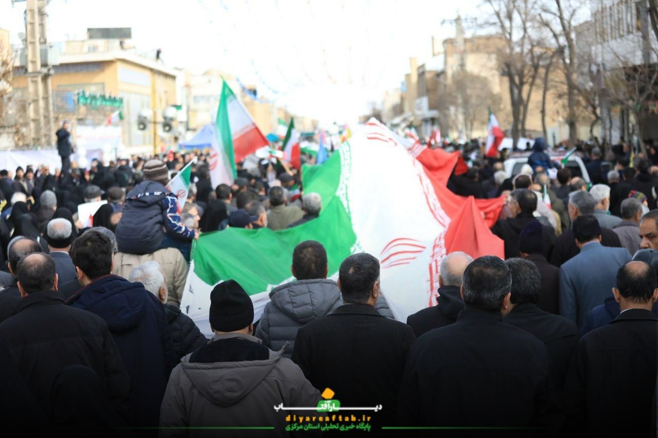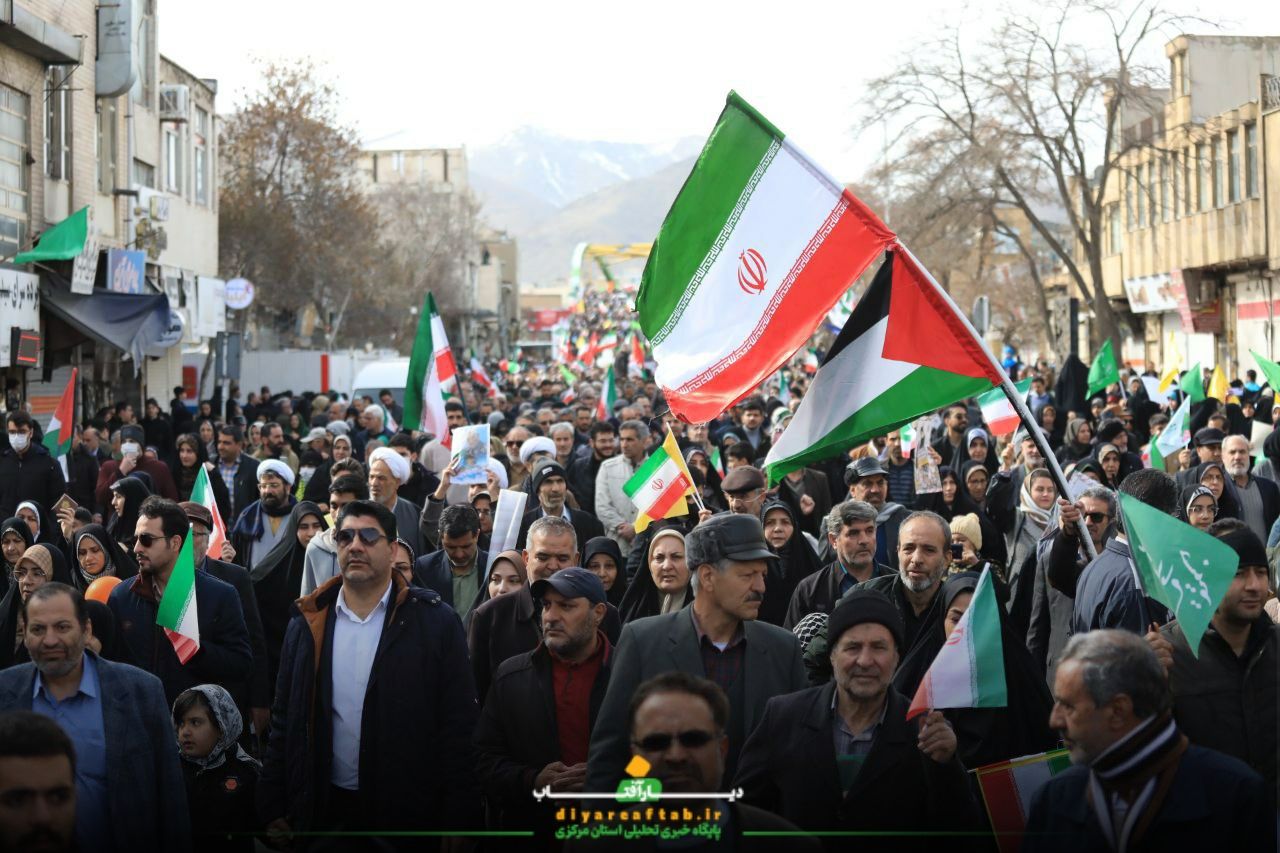 راهپیمایی ۲۲ بهمن در اراک در فضایی پرشور و منظم در حال برگزاریست، شرکتکنندگان با در دست داشتن پرچمهای ایران و پلاکاردهایی با مضامین انقلابی، در مسیرهای اعلامشده حرکت می کنند و در طول مسیر، شعارهایی همچون «اللهاکبر»، «استقلال، آزادی، جمهوری اسلامی» و دیگر شعارهای مرتبط با این مناسبت سر می دهند.